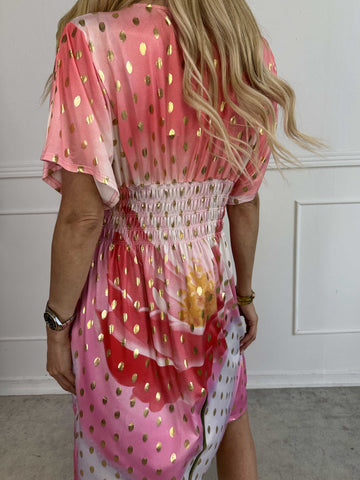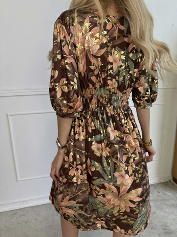 Pams Field Short - Kort elastisk kjole med blomstermotiv og guld dutter