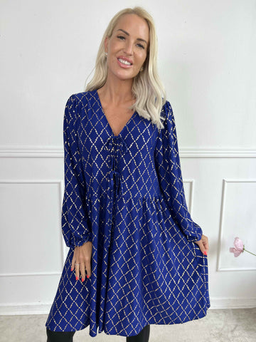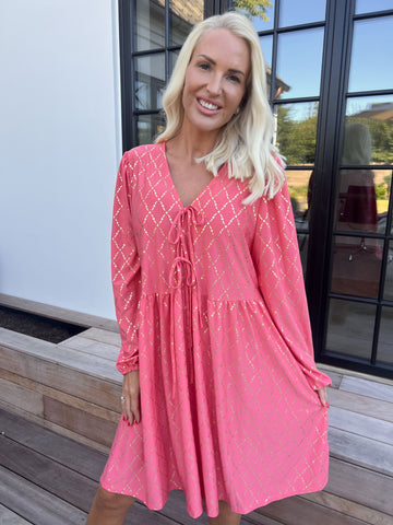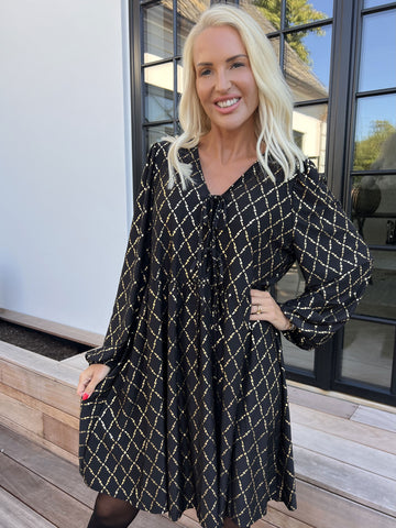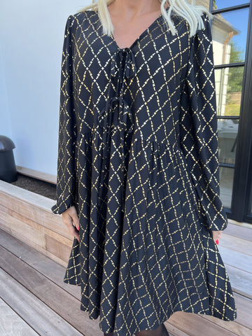 Cersei Gold Check - Babydoll kjole med guldprint og sløjfer