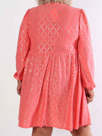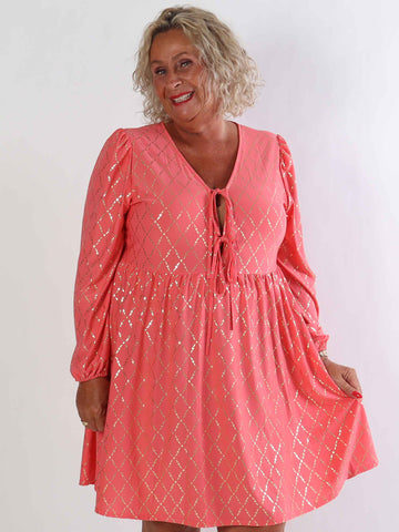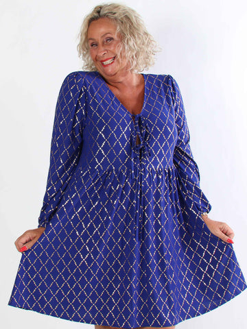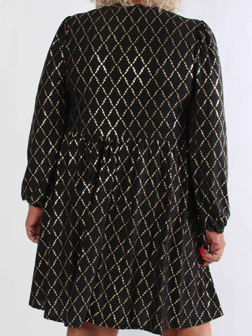 Cersei Gold Check - Plus size babydoll kjole med guldprint og sløjfer