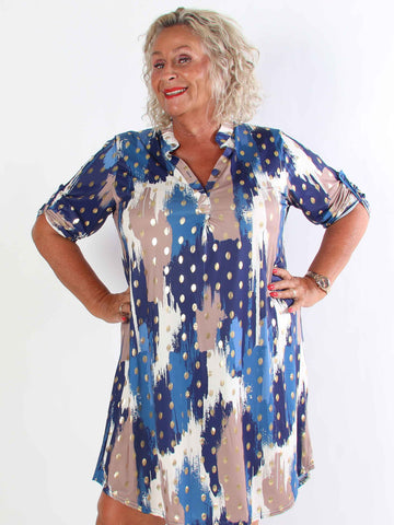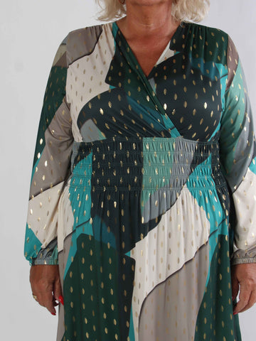 Ebba Paint Long - Elastisk flerfarvet plus size kjole med guld dutter