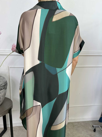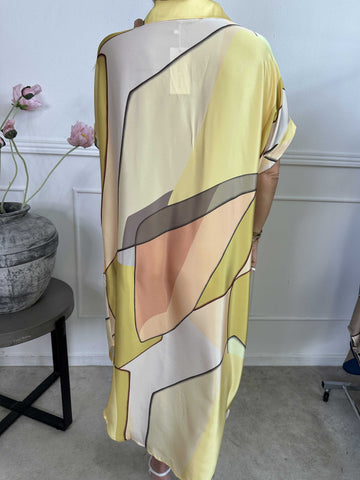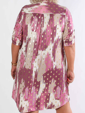 Pams Abstract Short L/S - Elastisk flerfarvet plus size kjole med guld detaljer