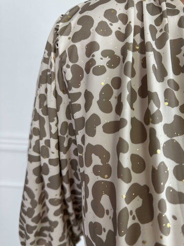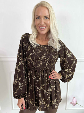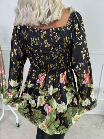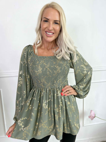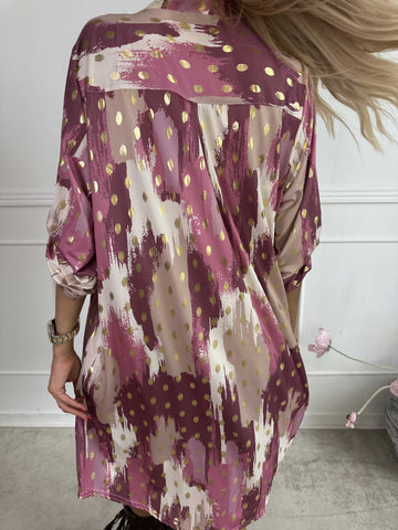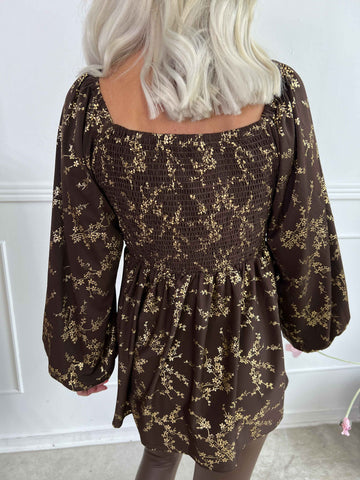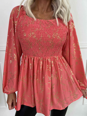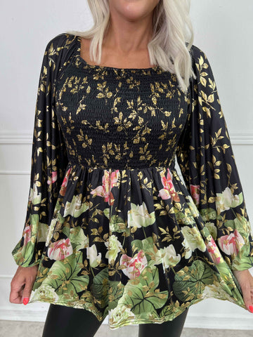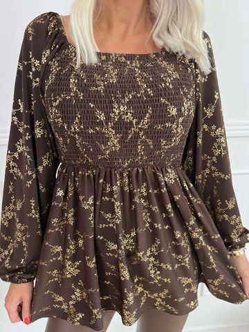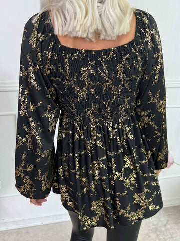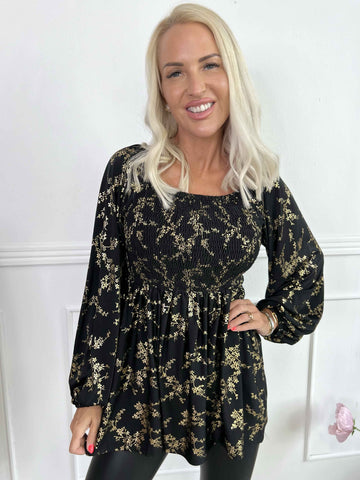 Elna Gold Shirt L/S - Elastisk bluse med guld print og smock over brystet
