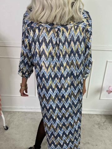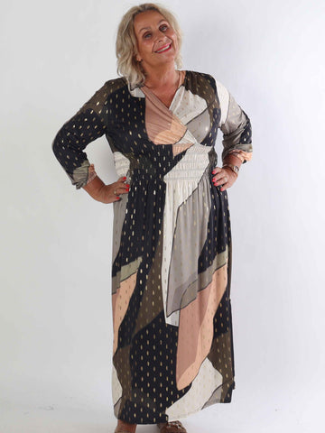 Ebba Zigzag Long - Elastisk mønstret plus size kjole med guld detaljer