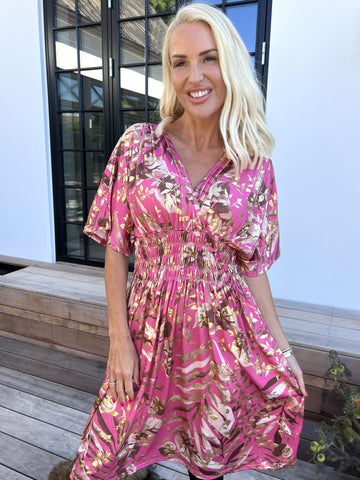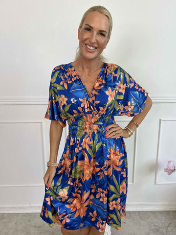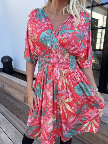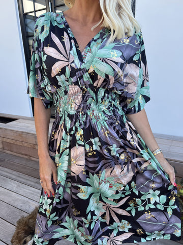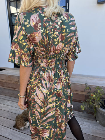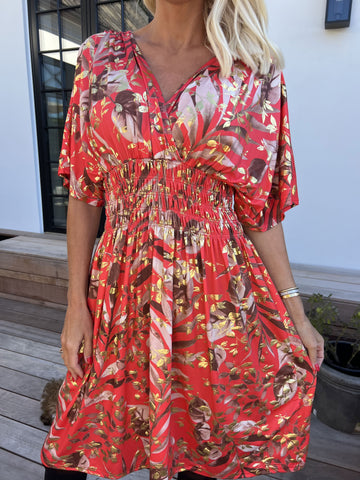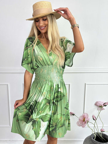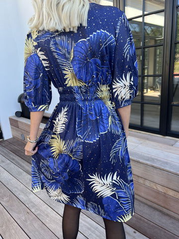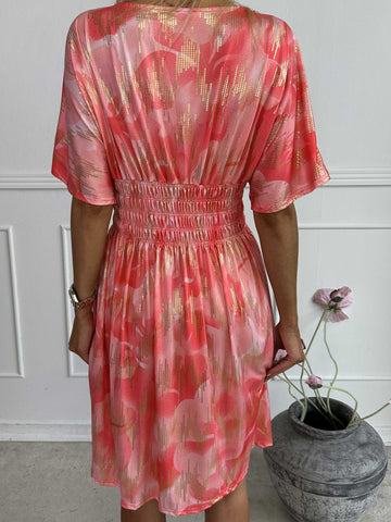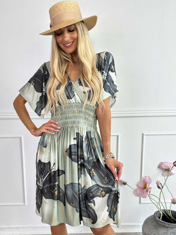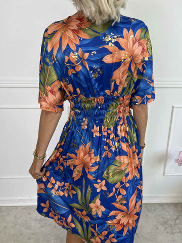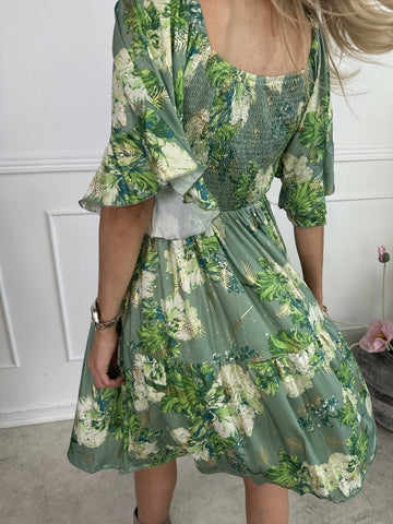 Pams New Leaf Short - Elastisk kjole med farvet blomsterprint og guld detaljer
