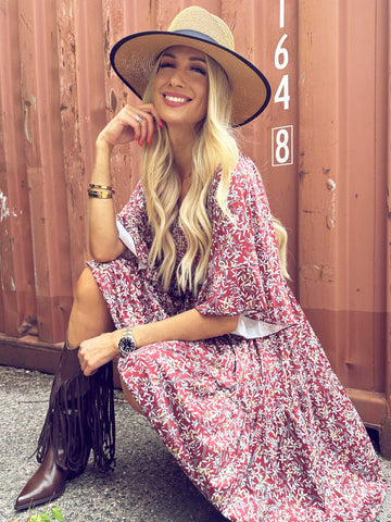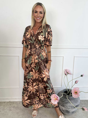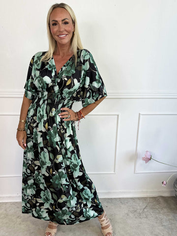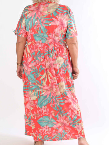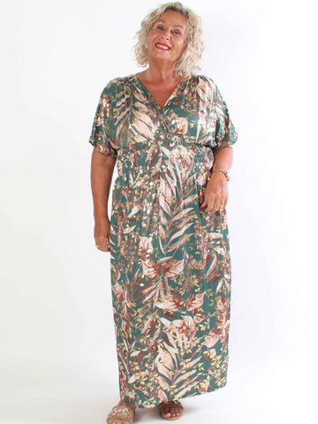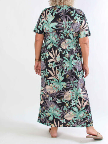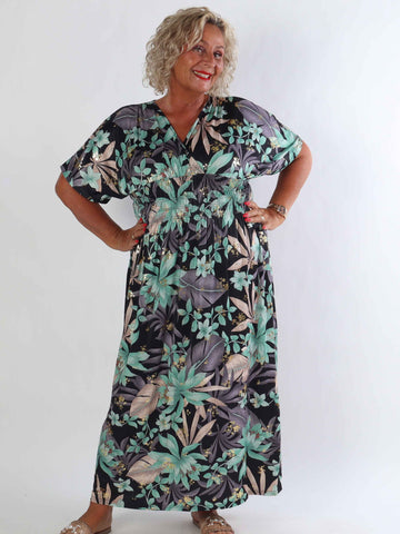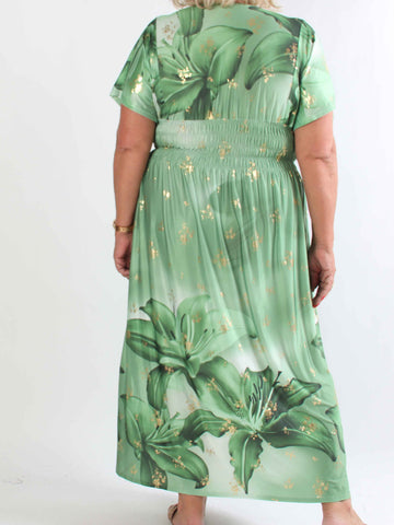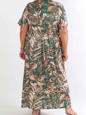 Pams New Leaf - Lang plus size kjole med blomsterprint og guld detaljer