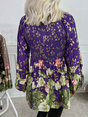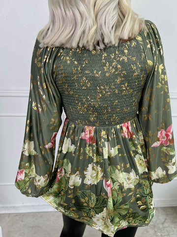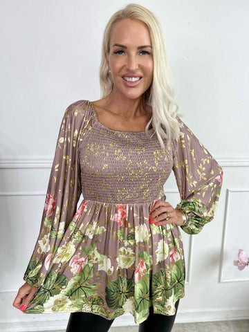 Elna Water Lily Shirt L/S - Elastisk bluse med blomsterprint og smock over brystet