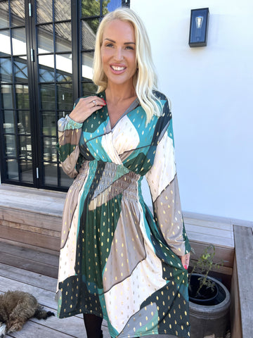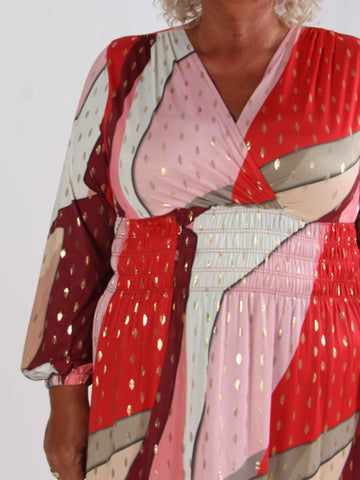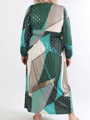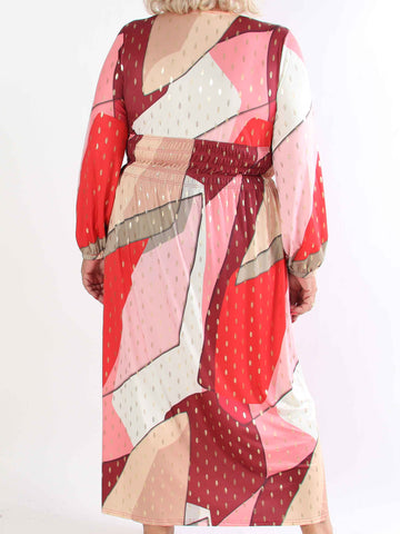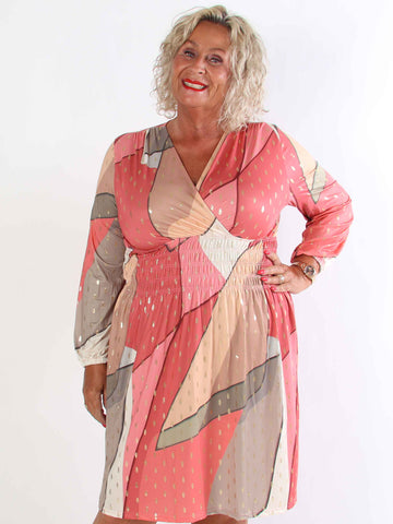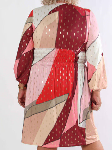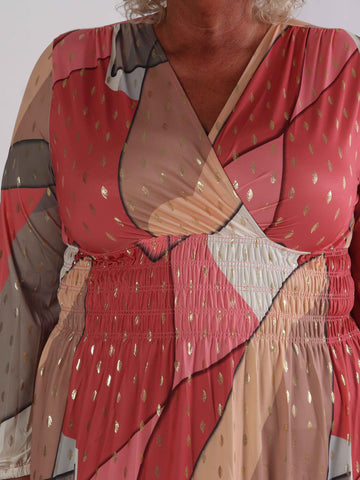 Pams Abstract L/S - Elastisk flerfarvet plus size kjole med guld detaljer