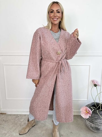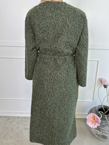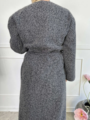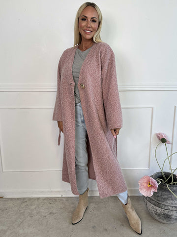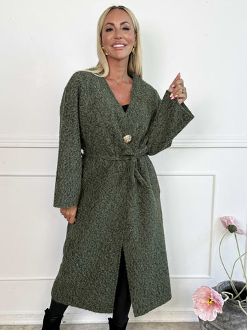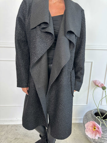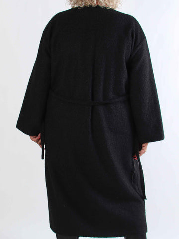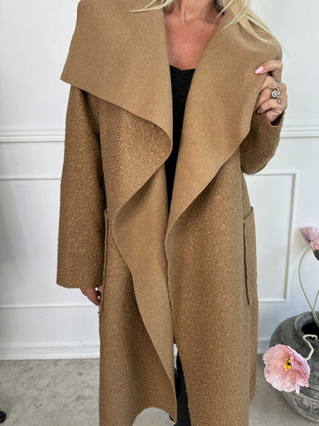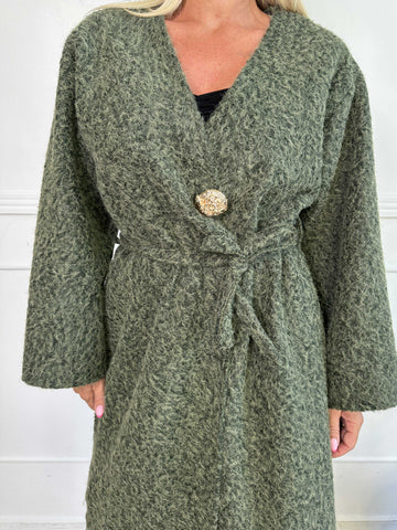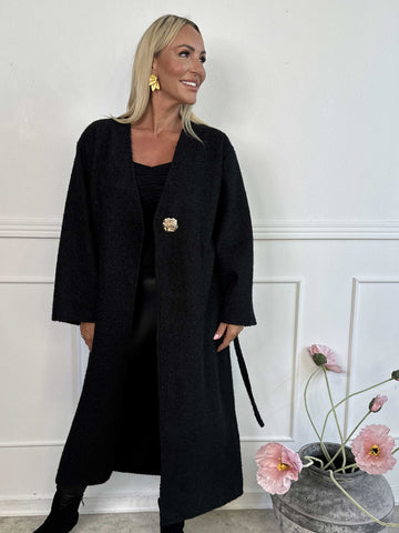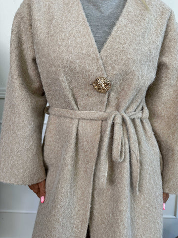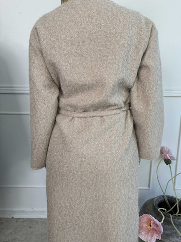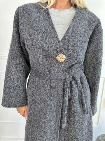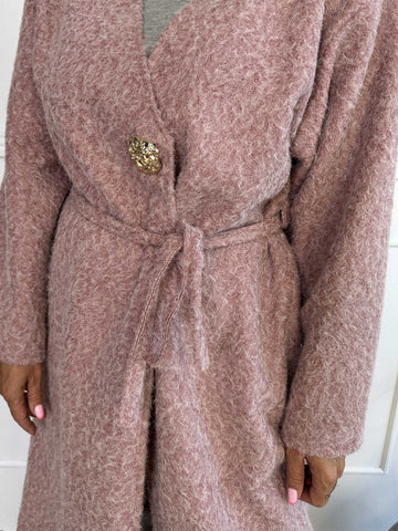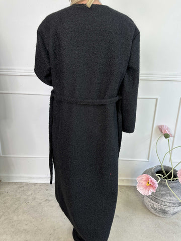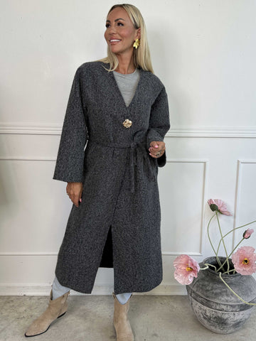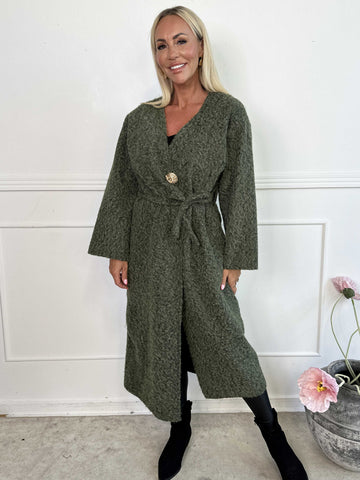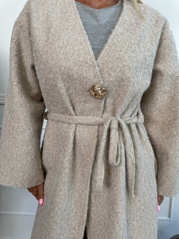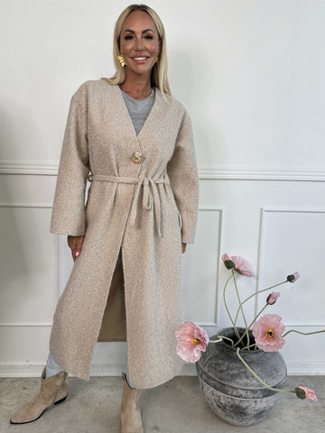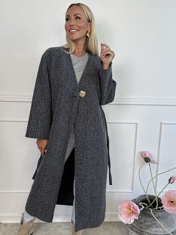 Solrun - Blød frakke med stor guld knap og bindebånd