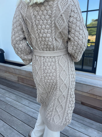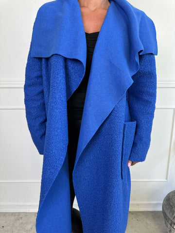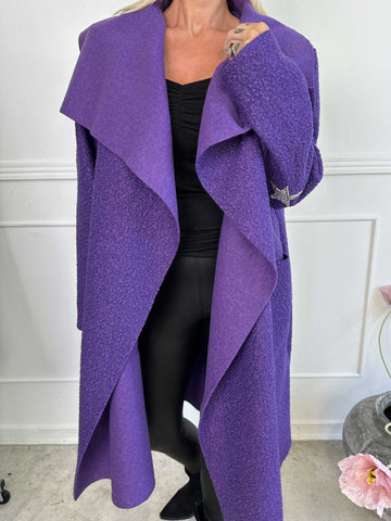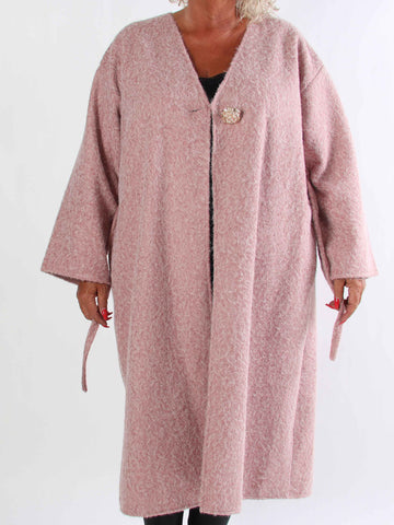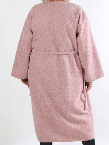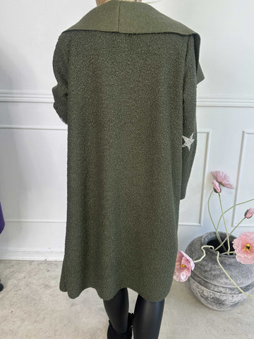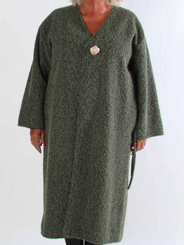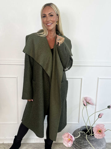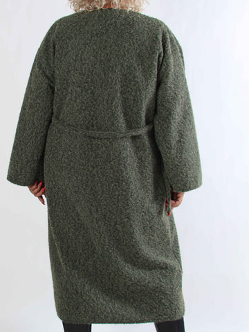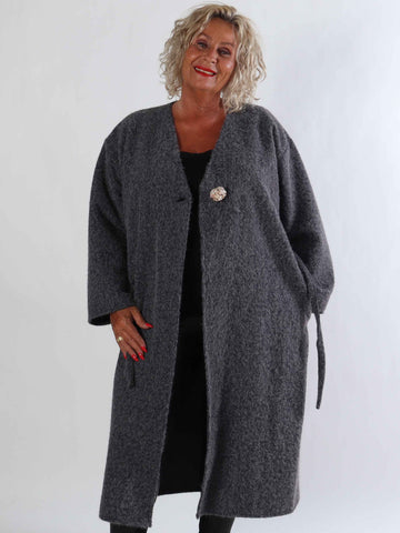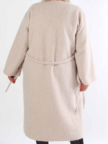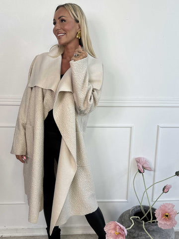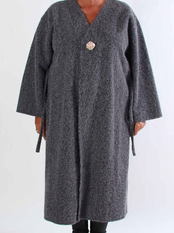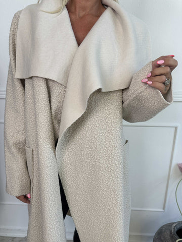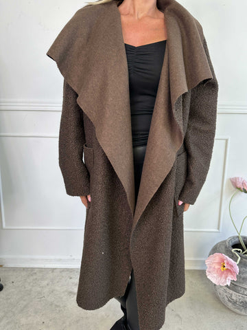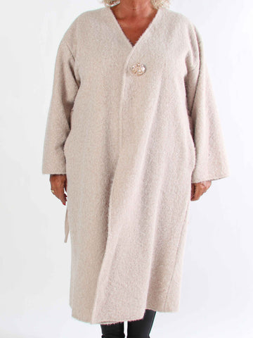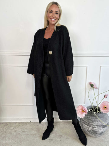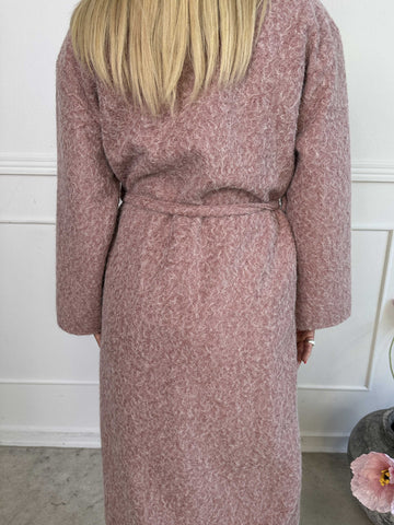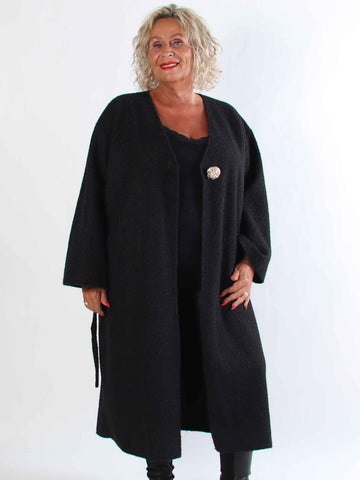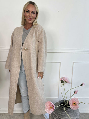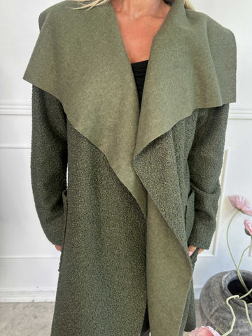 Solrun - Blød frakke med stor guld knap og bindebånd
