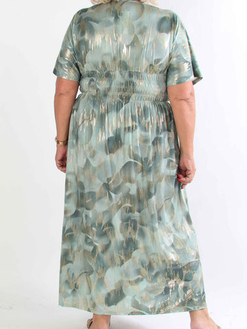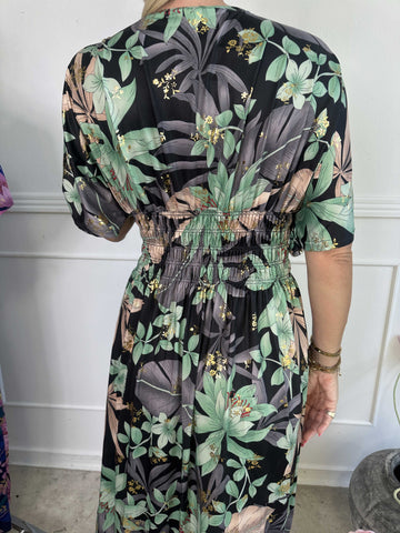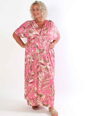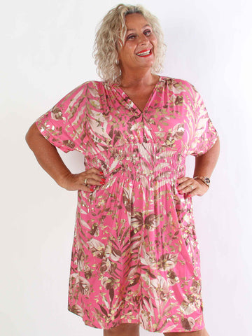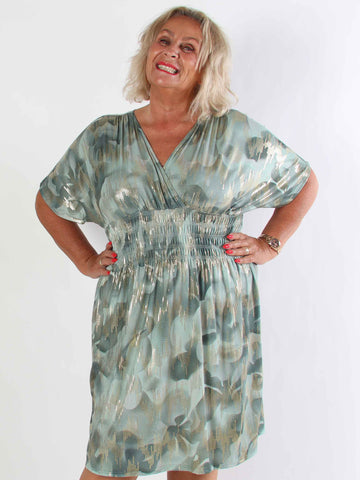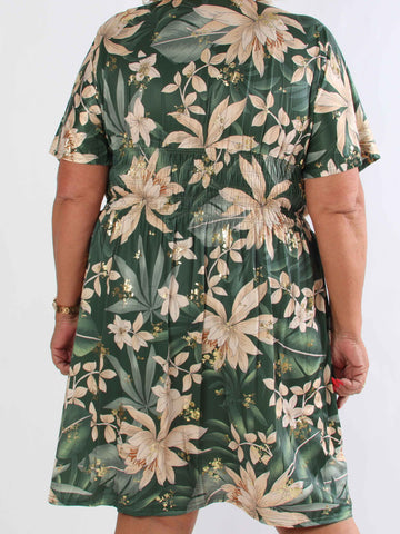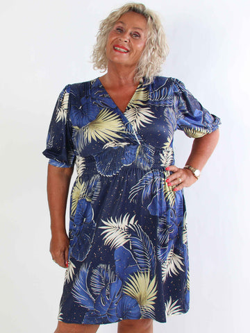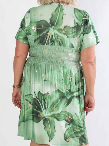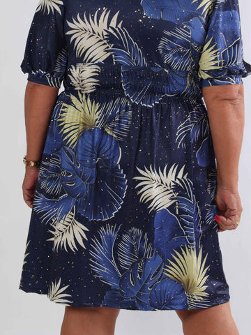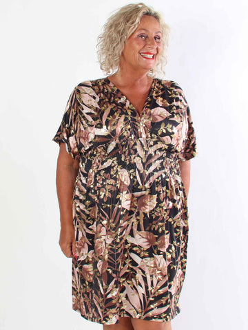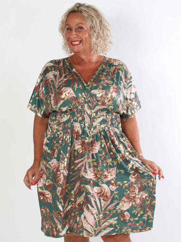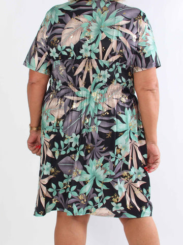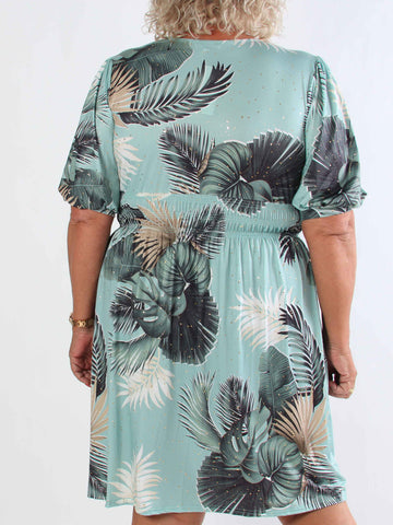 Pamina Palm Short - Elastisk plus size kjole med blad motiver og guld støv