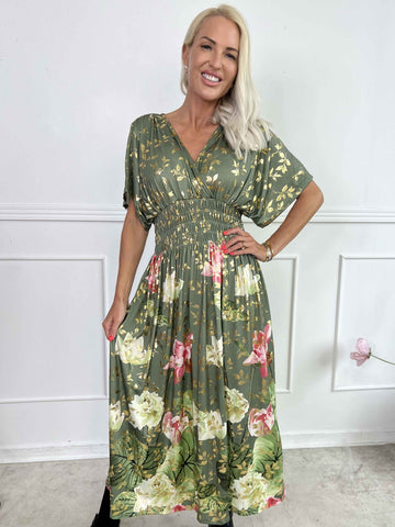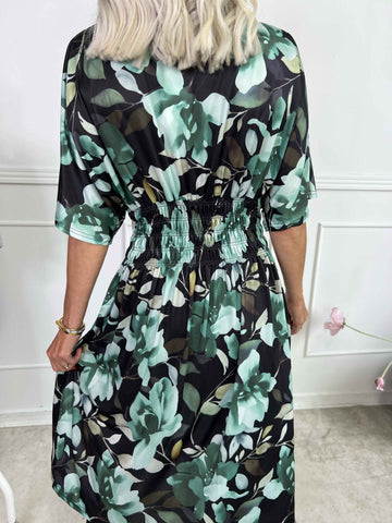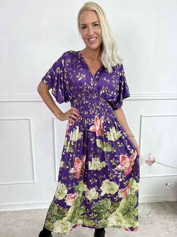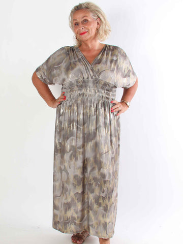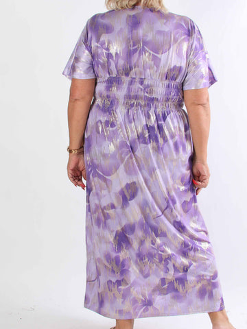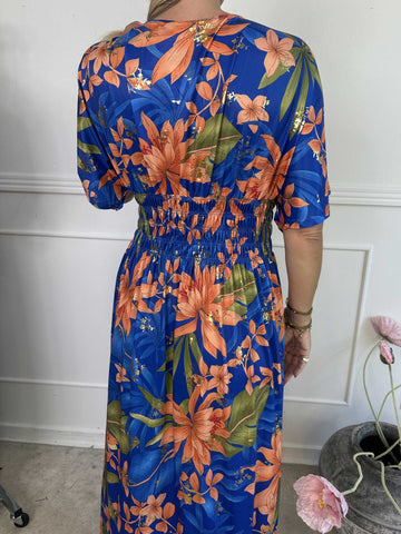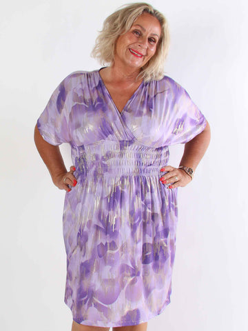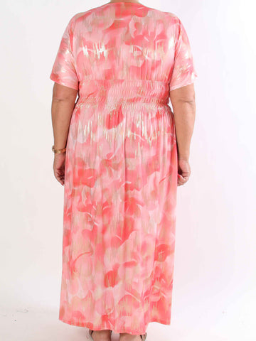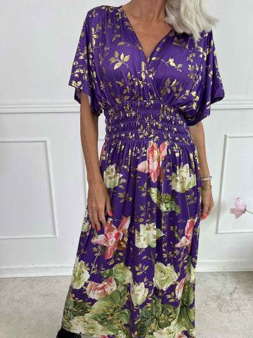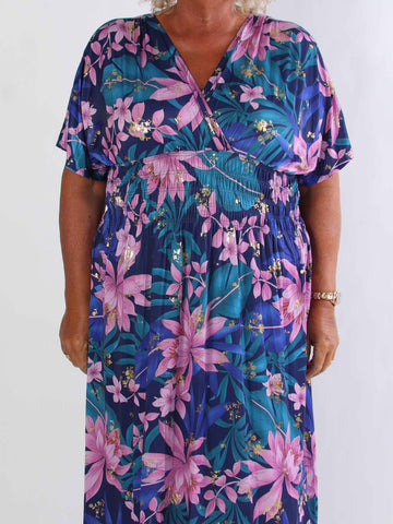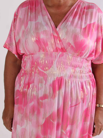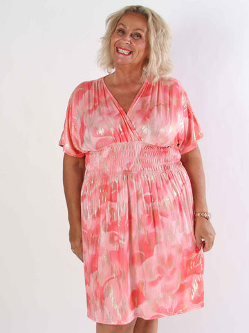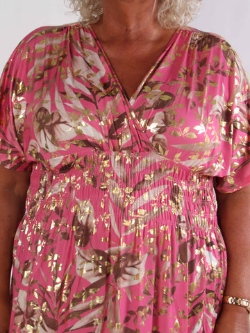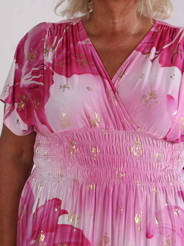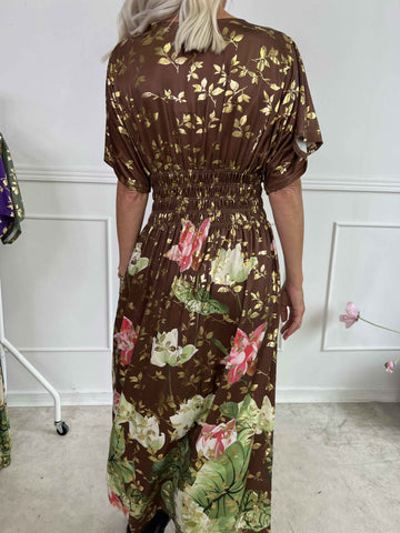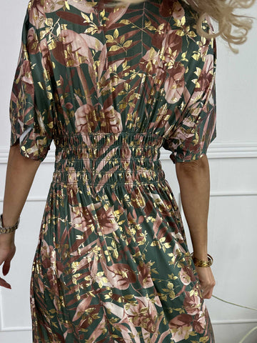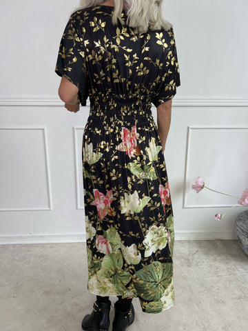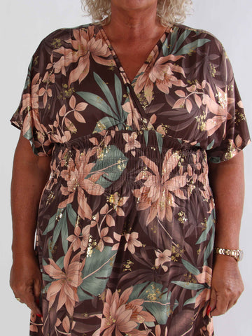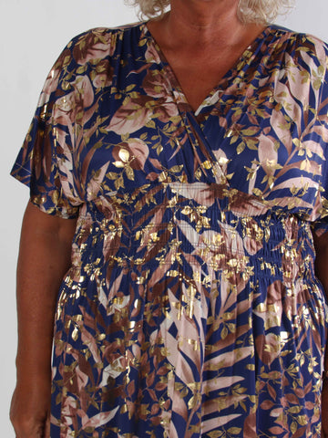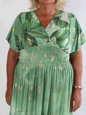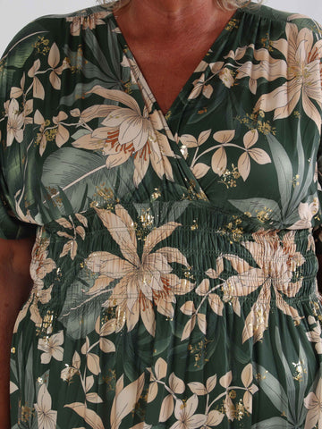 Pams Gold Leaf - Elastisk plus kjole med blomsterprint og guld detaljer
