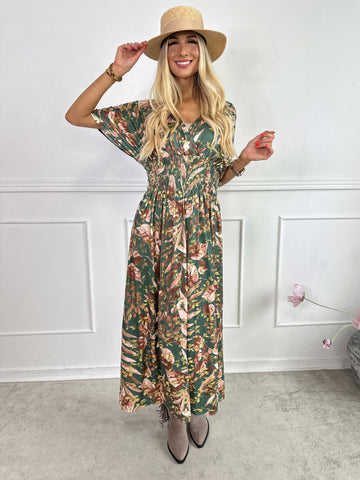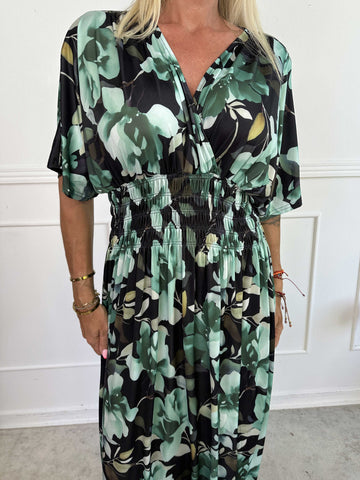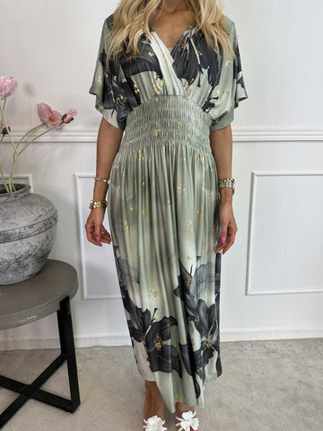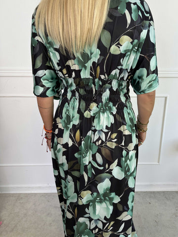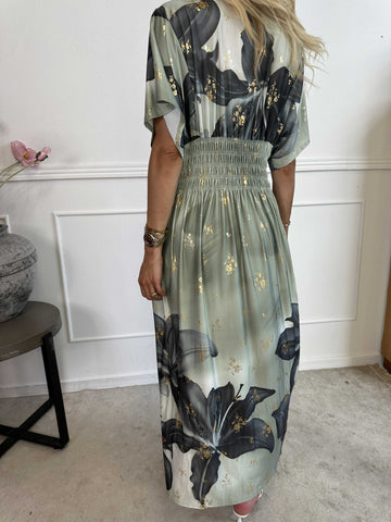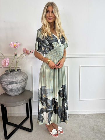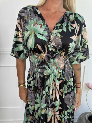 Pams New Leaf - Lang elastisk kjole med blomsterprint og guld detaljer