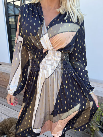 Pams Abstract Short L/S - Elastisk flerfarvet kjole med guld detaljer