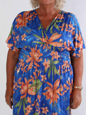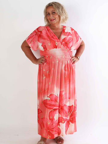 Pams Big Lily - Elastisk plus size kjole med store liljer og guld detaljer