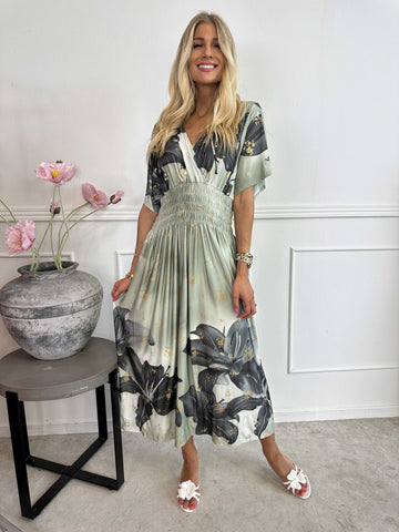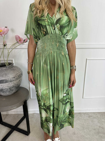 Pams Water Lily Midi - Elastisk kjole med blomsterprint og guld blade