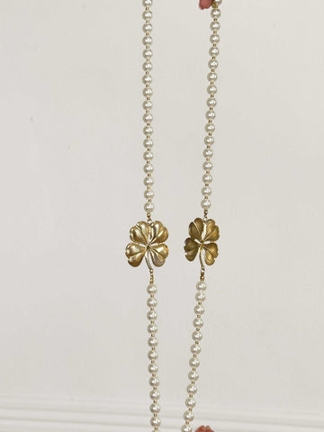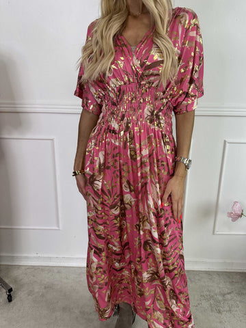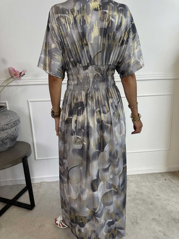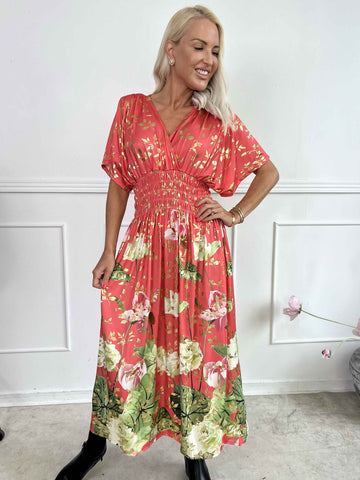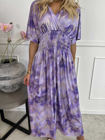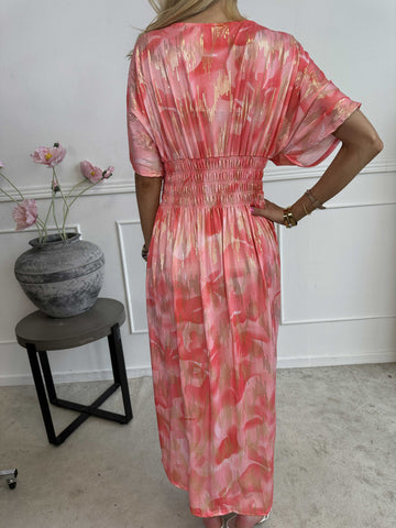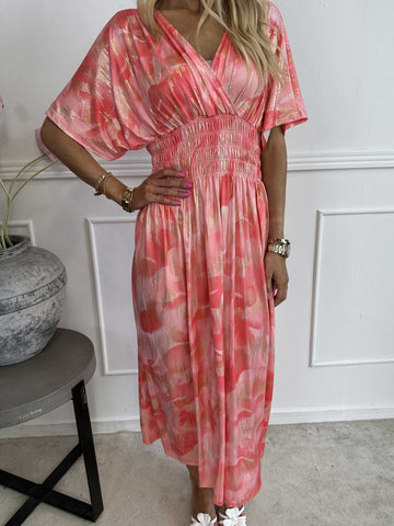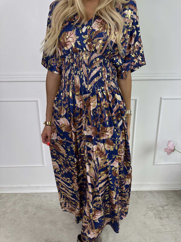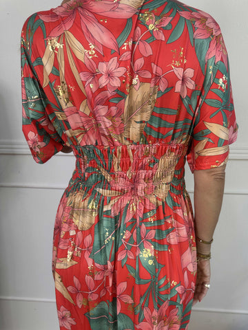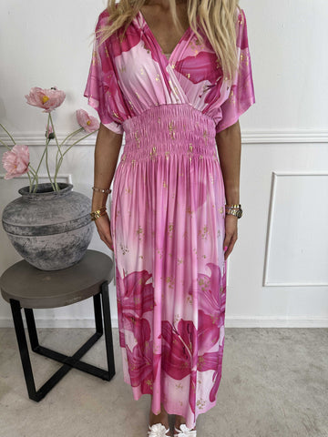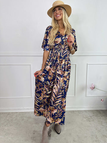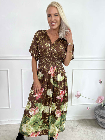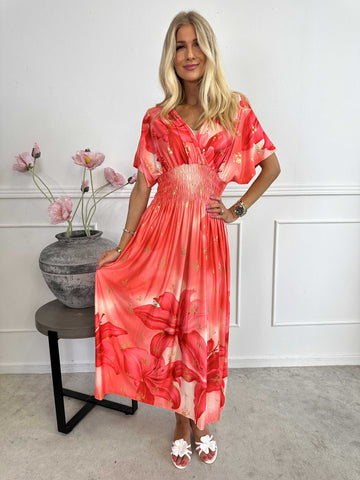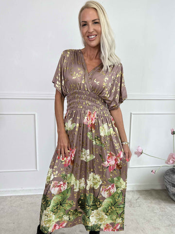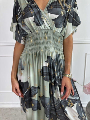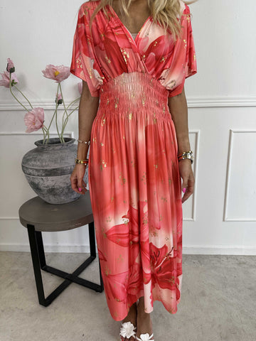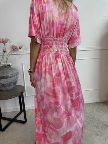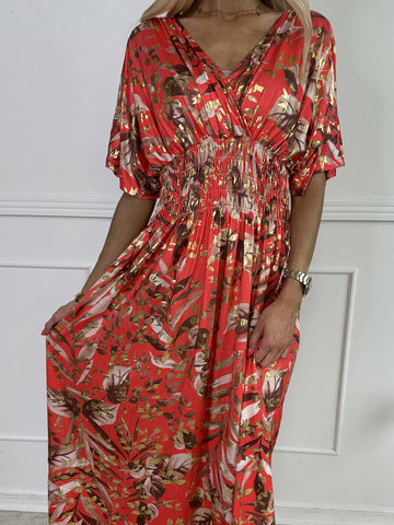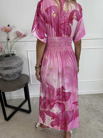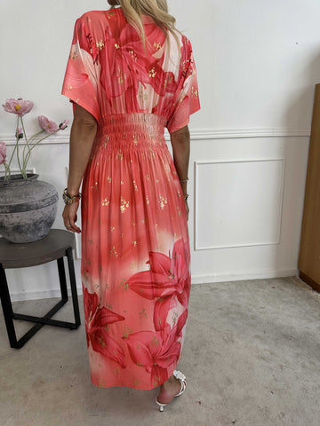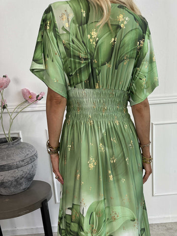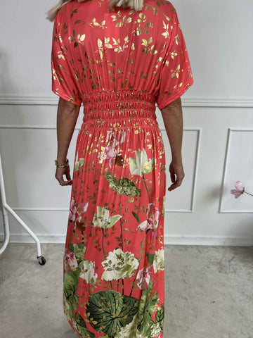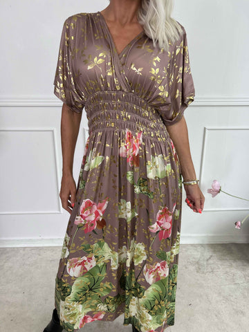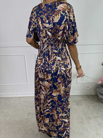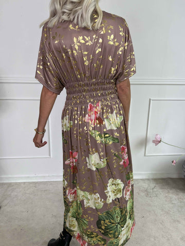 Pams Gold Leaf - Lang elastisk kjole med blomsterprint og guld detaljer