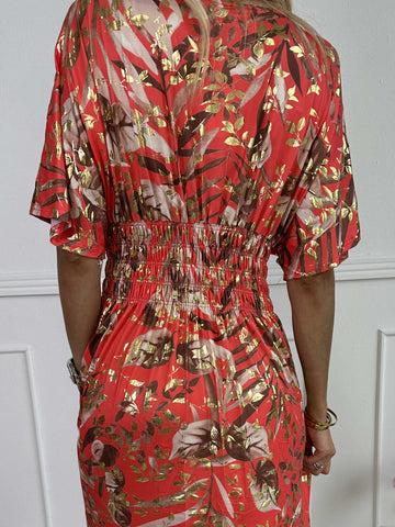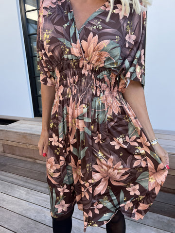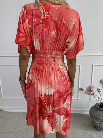 Pams Gold Leaf Short - Elastisk kjole med blomsterprint og guld detaljer