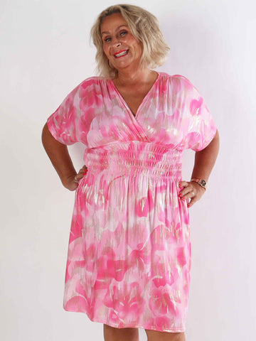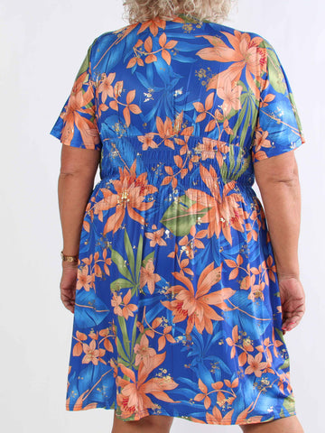 Pams New Leaf Short - Plus size kjole med farvet blomsterprint og guld detaljer