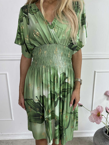 Pamina Palm Short - Elastisk kjole med blad motiver og guld støv