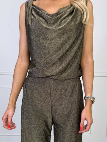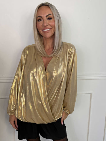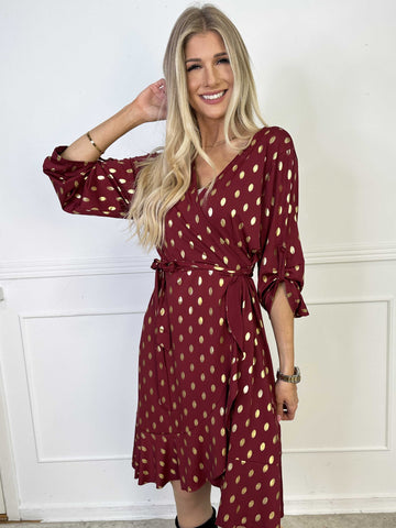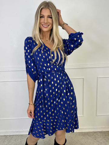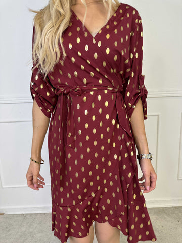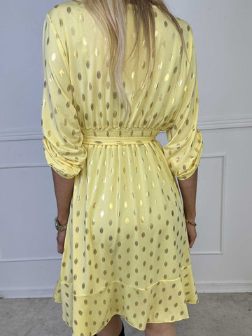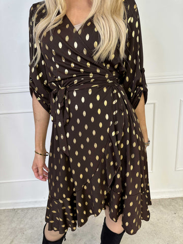 Savina Gold - Elastisk kjole i slå-om-look med guld dutter