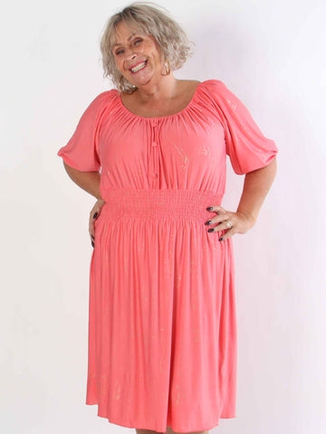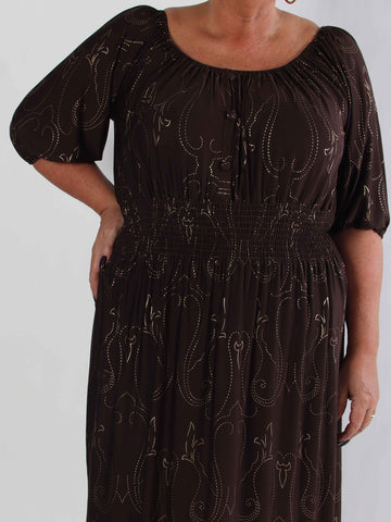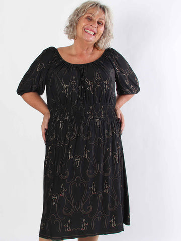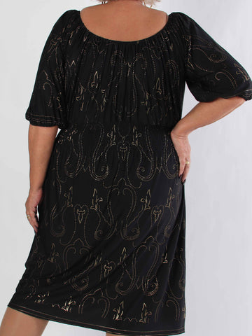 Cora Royal Gold Midi - Elastisk plus size kjole med guld print