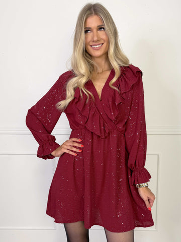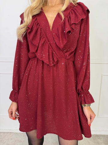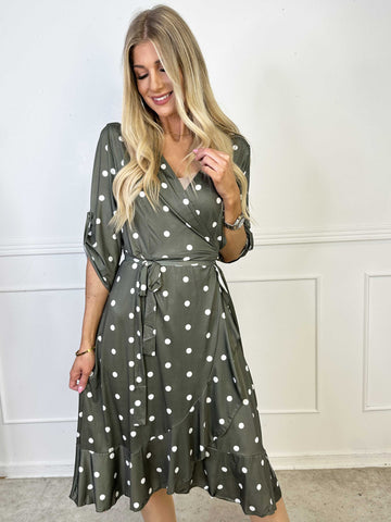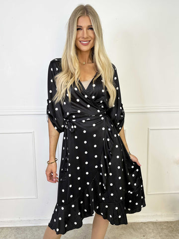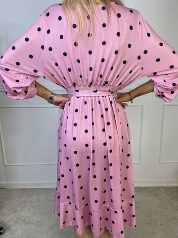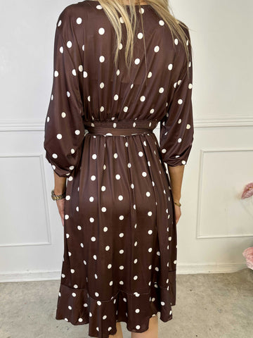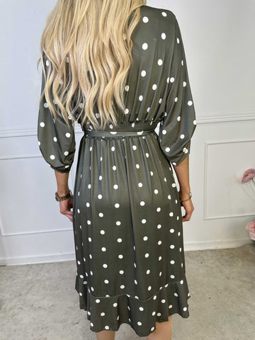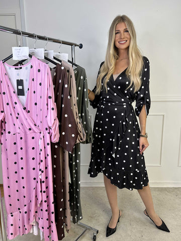 Savina Dot - Elastisk kjole i slå-om-look med prikker og flæsekant