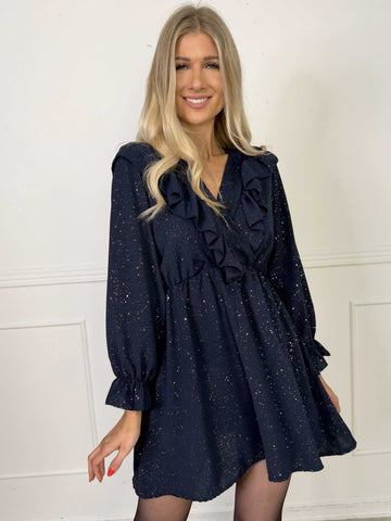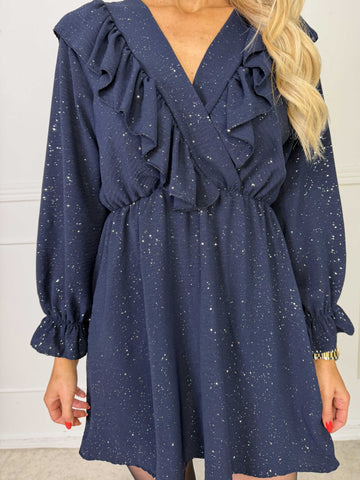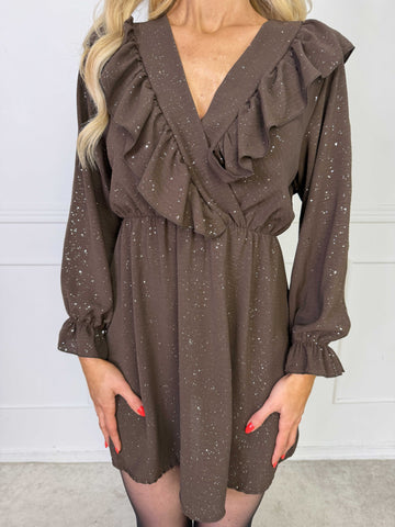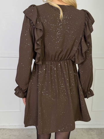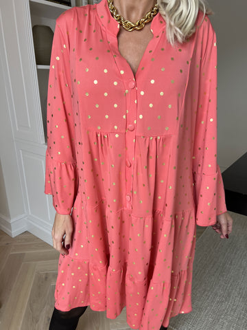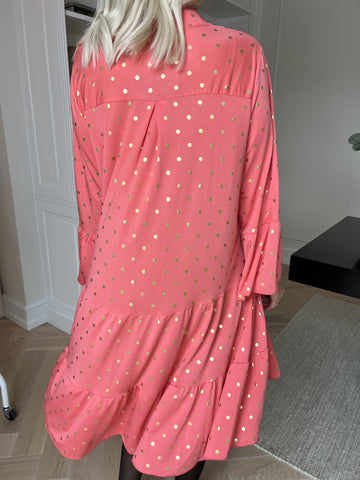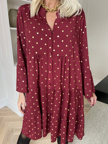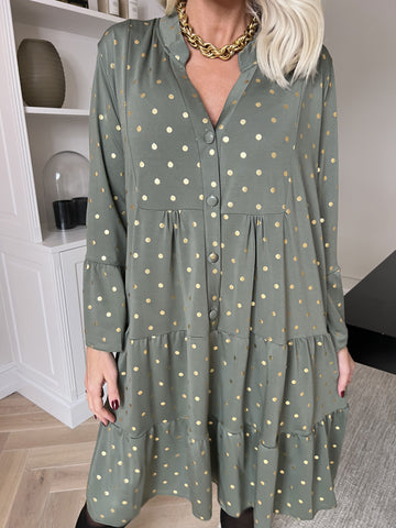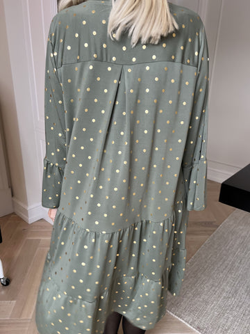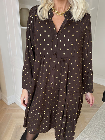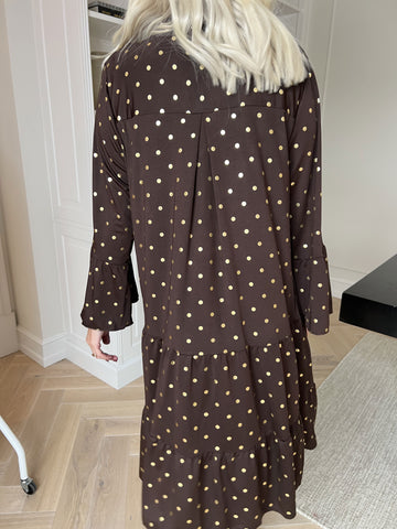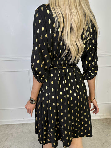 Milania Dot - Elastisk kjole med guld prikker og flæselag