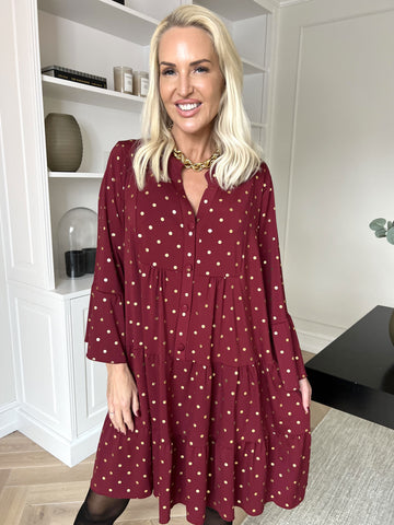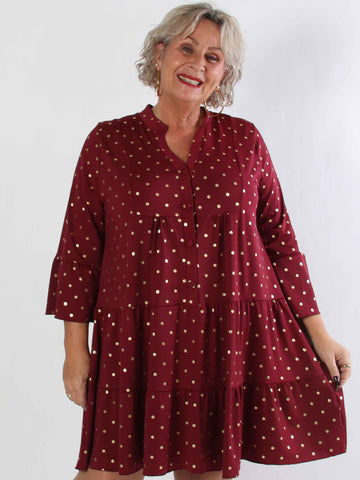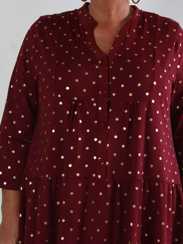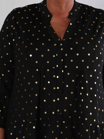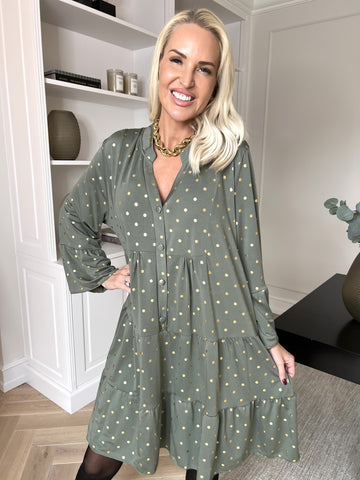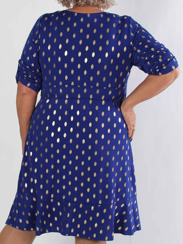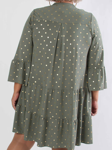 Milania Dot - Elastisk plus size kjole med guld prikker og flæselag
