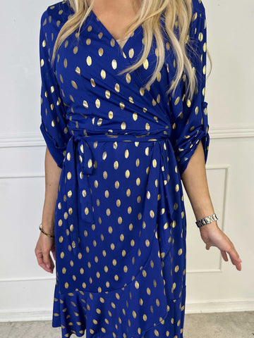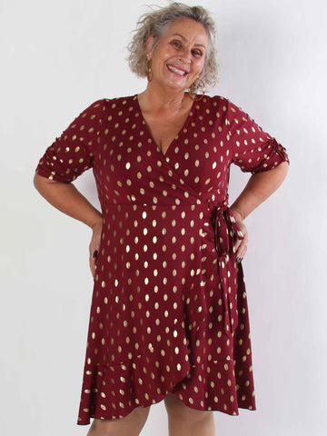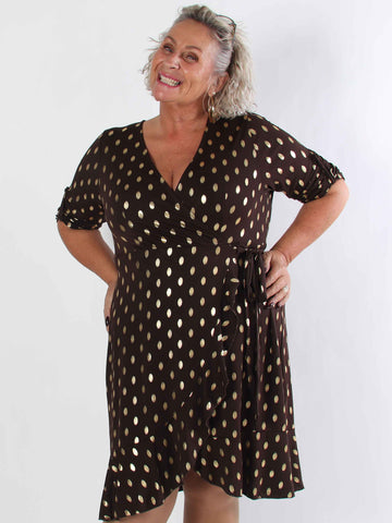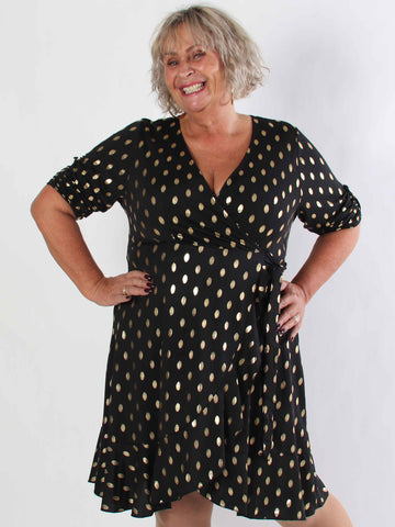 Savina Gold - Elastisk plus size kjole i slå-om-look med guld dutter