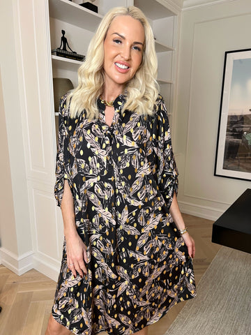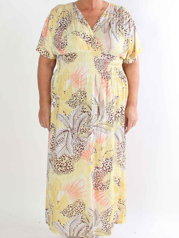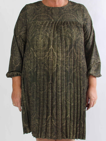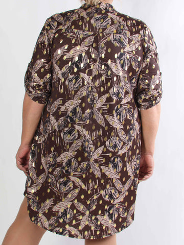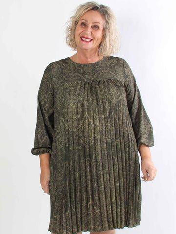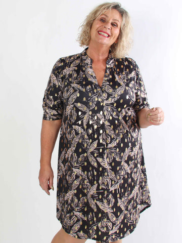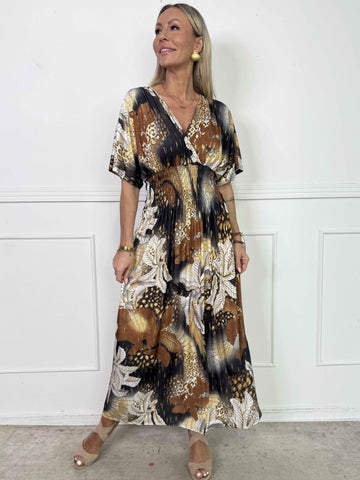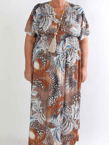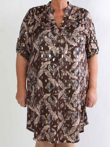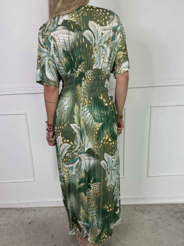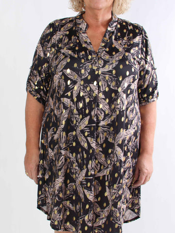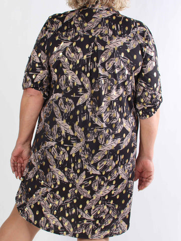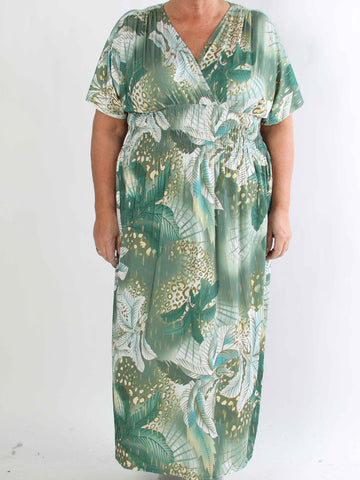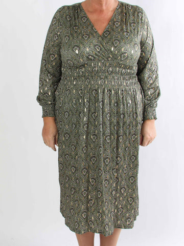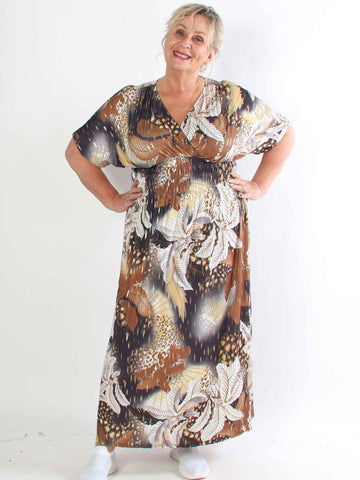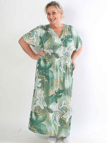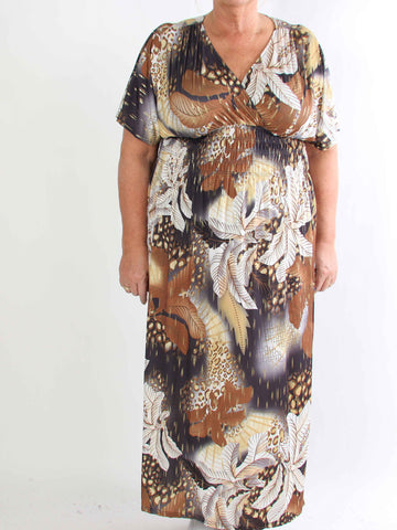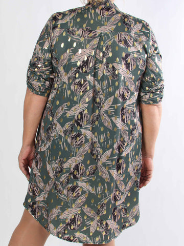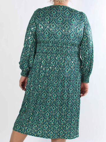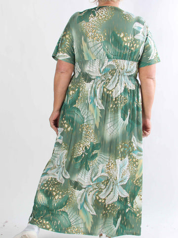 Ebba Leaf Long - Elastisk plus size kjole med bladmønster og guld dutter