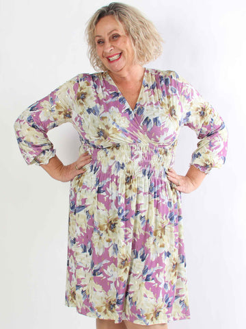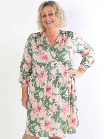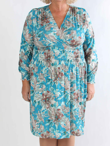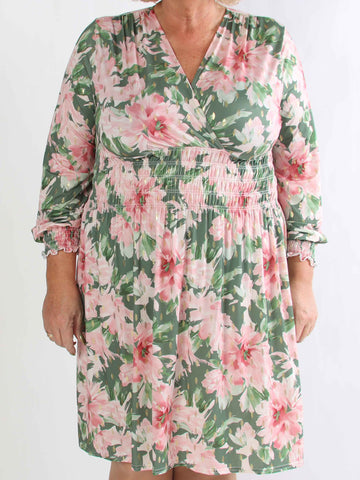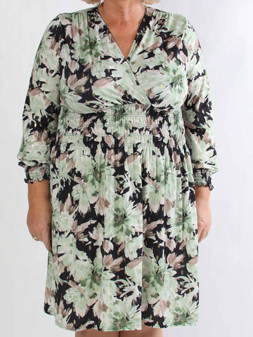 Pams Flora Short L/S - Plus size kjole i krølfrit stof med lange ærmer
