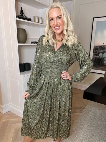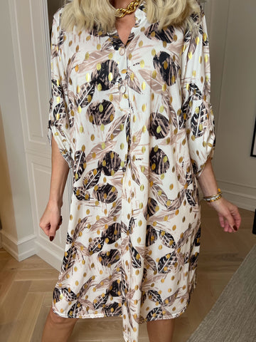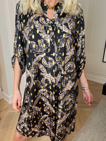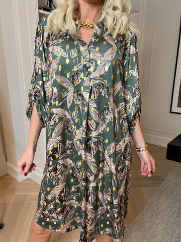 Ebba Leaf Long - Elastisk kjole med fint bladmønster og guld dutter