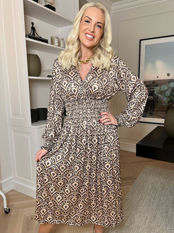 Pams Pattern Midi L/S - Plus size kjole i krølfrit stof med lange ærmer